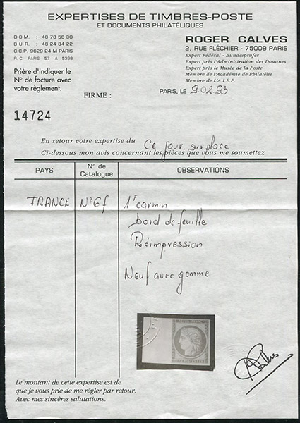 N° 6f réimpression bord de feuille avec certificat Calves tirage 4350 On distingue les réimpressions par la couleur se sont celles de 1862, une infime différence de format, une impression soignée et enfin pour les grands bords de feuille pas de filet d’encadrement. Timbre rare dans cette qualité Facture certificat comme tous les timbres du site